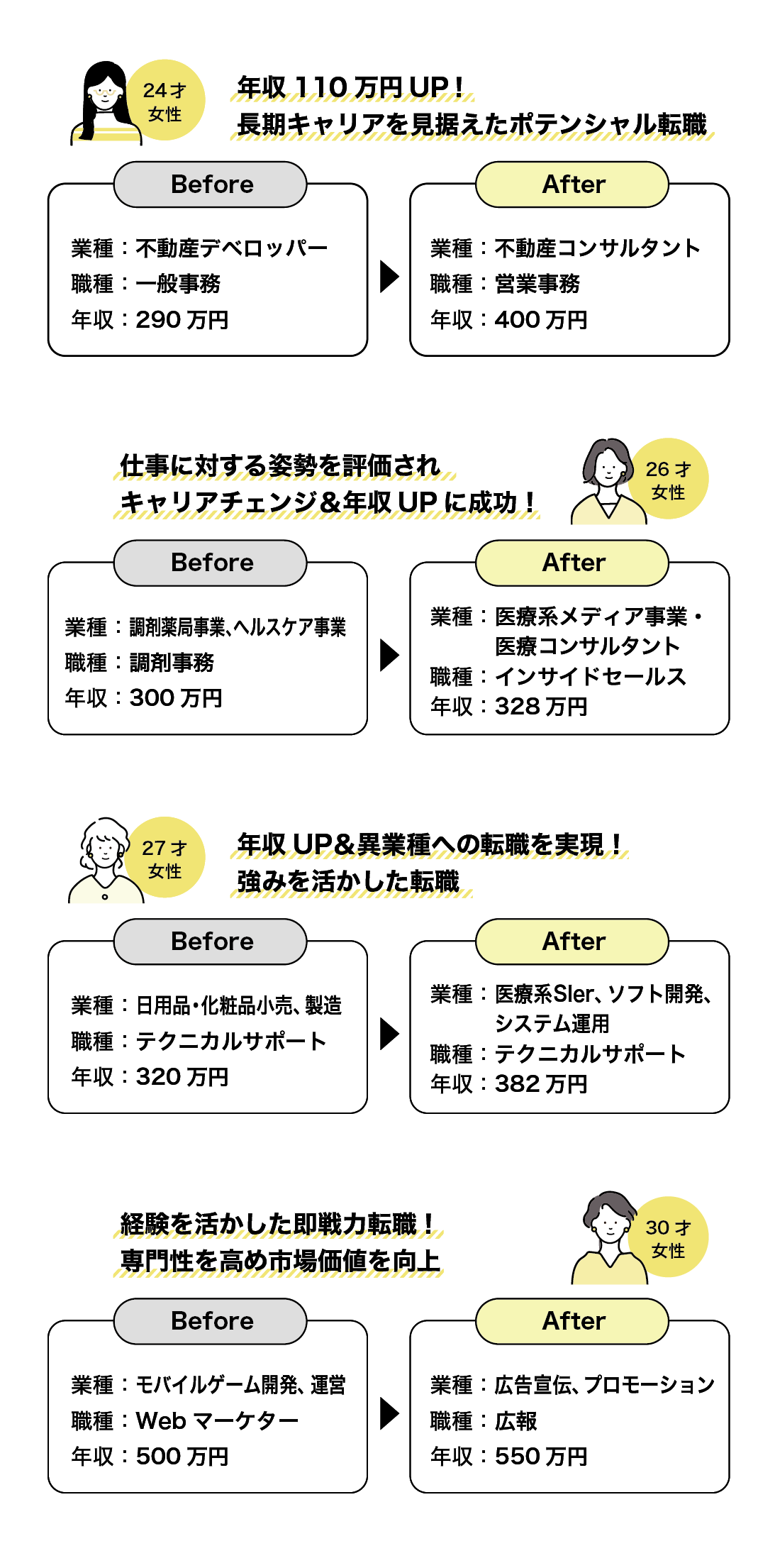 創業以来、当社は女性に特化した転職エージェントとして、関西(大阪・兵庫・京都・奈良・滋賀・和歌山)を中心に、全国各地の女性の転職をサポートしてまいりました。その相談実績は10,000件以上! 女性のキャリアは、結婚や出産などのライフイベントによって大きく変化します。プライベートとの両立、これまでの実績や経験、これからのキャリアプランなど、人生とキャリアを多角的に捉え、「転職」を通じて、女性がイキイキと輝く人生をサポートいたします。