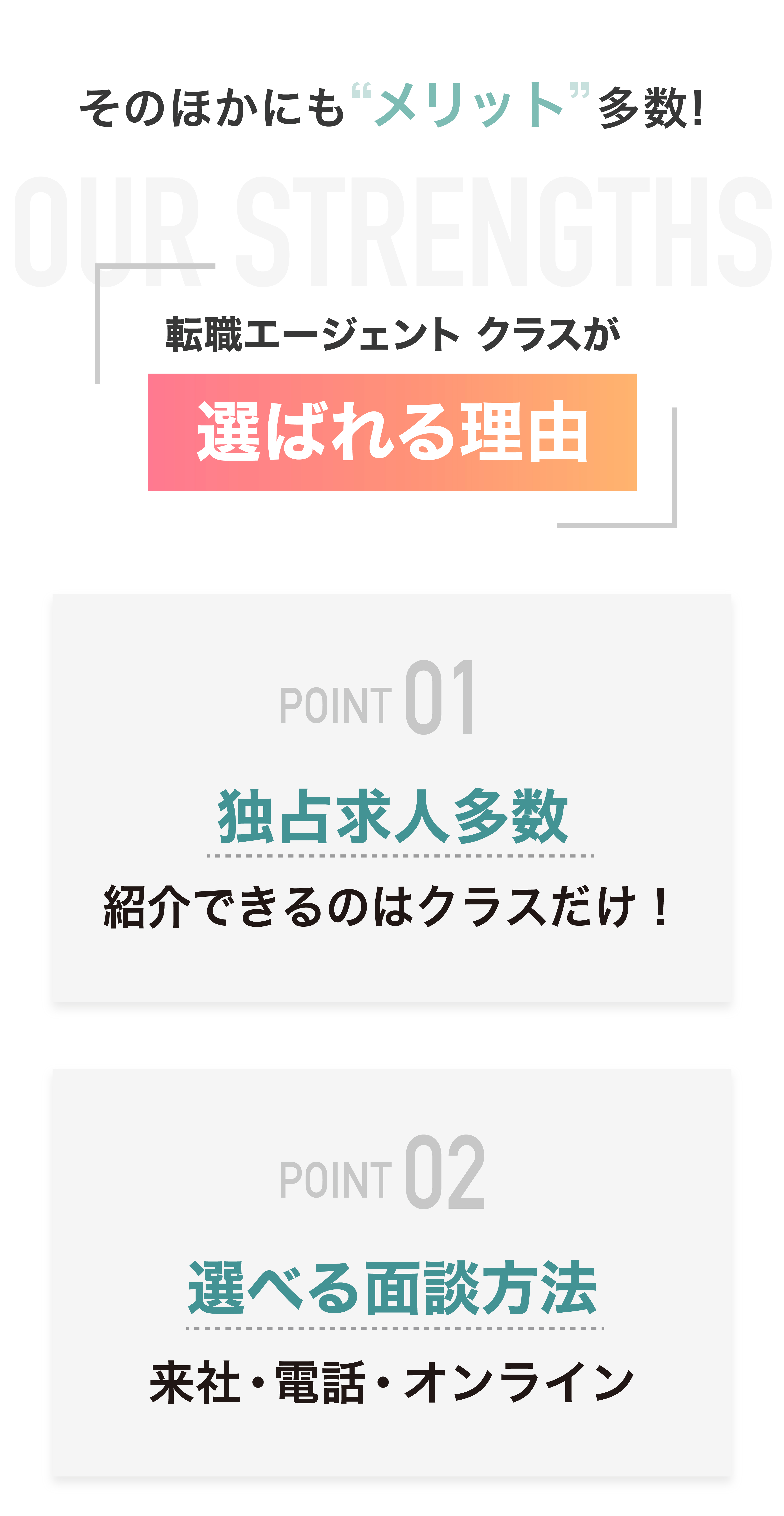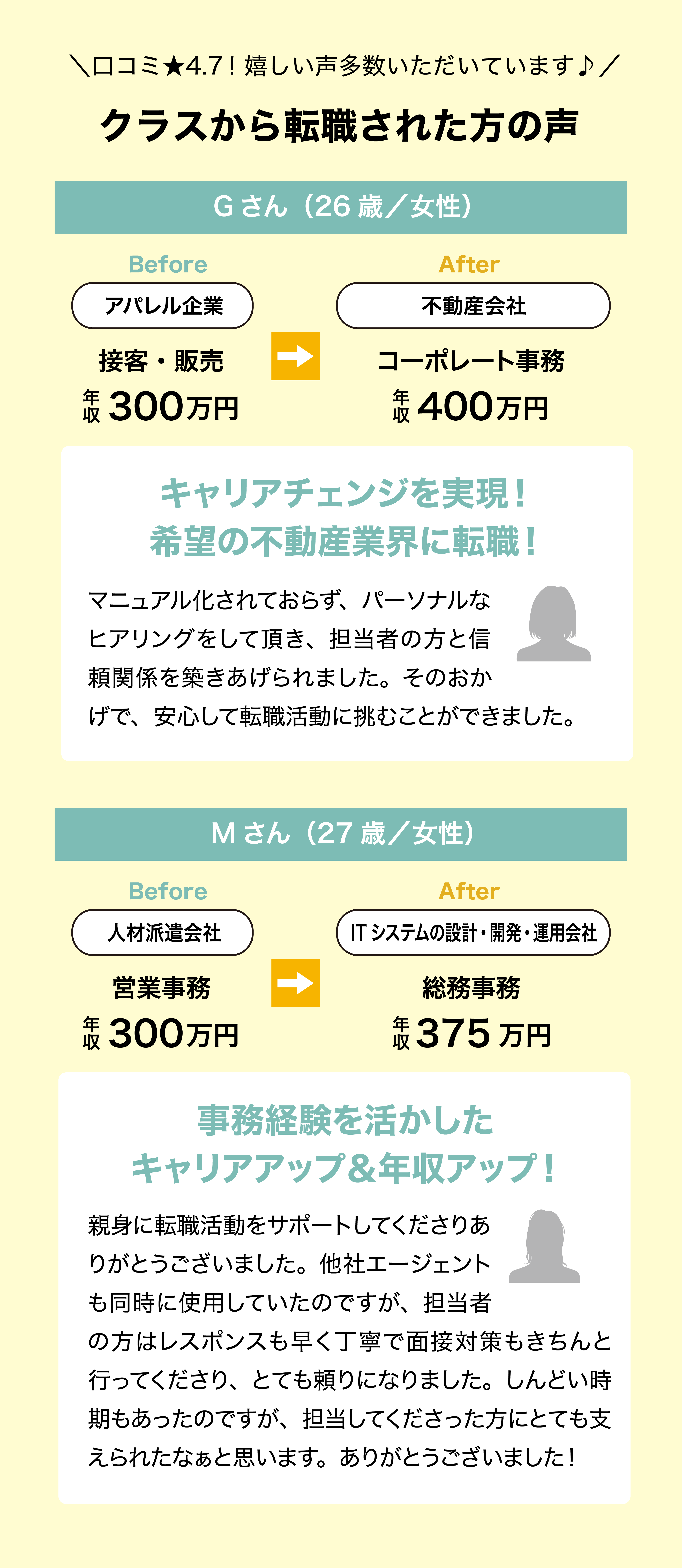 ▽▽▽ 30秒で入力完了♪ ▽▽▽ お名前必須 フリガナ必須 性別必須 男性女性 生年月日必須 電話番号必須 つながりやすい時間帯 指定なし午前中午後夕方 メールアドレス必須 都道府県必須 市区町村必須 就業状況必須 在職中離職中 現在年収 ※直近の正社員の年収をお選びください 〜199万円200万円〜249万円250万円〜299万円300万円〜349万円350万円〜399万円400万円〜449万円450万円〜499万円500万円〜549万円550万円〜599万円600万円〜649万円650万円〜699万円700万円〜 転職希望時期必須 1ヶ月以内1~3ヶ月以内3ヶ月以上先未定 経験職種 営業オフィスワーククリエイティブ販売・サービスエンジニア、IT・システム介護・医療・福祉技術系製造・工場その他 希望職種 営業オフィスワーククリエイティブ販売・サービスエンジニア、IT・システム介護・医療・福祉技術系製造・工場その他 ご入力頂いたメールアドレス宛に、株式会社クラスからのお知らせを配信してもよろしいですか?必須 はいいいえ その他 ご自由にご入力下さい 個人情報の取扱いに関する告知文 当社では問合せフォームから取得する個人情報の利用にあたり、下記の事項を明示します。 a) 事業者の名称 株式会社 クラス b) 個人情報保護管理者の職名、所属及び連絡先 連絡先名称:個人情報相談受付窓口 個人情報保護管理者:松室 匡哉 住所:〒541-0047 大阪市中央区淡路町3丁目5-13 創建御堂筋ビル9F TEL:06-6210-1855 c) 個人情報の利用目的 人材紹介事業における転職支援サービスのご提供のため d) 個人情報を第三者に提供する場合 当社では、この度取得する個人情報をご登録者の方の紹介のために紹介先企業または求人情報を保有する職業紹介事業者へ提供します。それ以外には法令に基づく場合や人の生命、身体又は財産の保護のために緊急の必要がある場合等を除き、あらかじめ同意を得ることなく個人情報を第三者に提供いたしません。 e) 個人情報の取扱いの委託を行う場合 当社は、前記c)の利用目的達成のために必要な範囲内で、当社が信頼に足ると判断した協力会社(情報処理等の業務委託先など)に委託する場合があります。 f) 個人情報の開示等の請求について 当社は、開示対象個人情報について、利用目的の通知、開示、訂正、追加又は削除、利用の停止、消去又は第三者への提供の停止を求められた場合は、これに応じます。その場合の問合せ窓口は、上記個人情報保護管理者です。 g) 個人情報の提供の任意性 個人情報の提供は任意です。ご提供いただけない場合は、お問合せについて正確なご回答を行うことができない可能性があります。 h) 自動的な情報の取得 当社では、ご本人様が容易に認識出来ない方法(CookieやWebビーコン等) 個人情報を取得することは一切いたしません。 個人情報の取扱いに同意します 電話受付 / 平日 9:30〜18:30 TEL.06-6210-1855 ー 会社概要 ー copyright © KRAS Co., Ltd. All Rights Reserved.